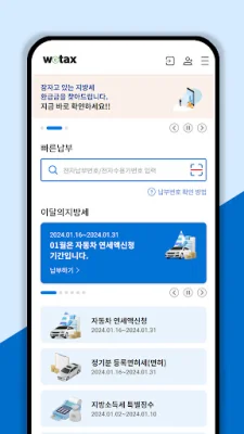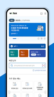 Some of the menus include reporting for acquisition tax, registration license tax, local income tax, and stamp duty, as well as applying for automatic payment, car tax installment payment, property tax installment payment, electronic delivery, and notification delivery location. Users can also check their payment status and history, apply for refunds, and issue documents such as local tax payment confirmation, tax payment certificate, and tax certificate. Additionally, users can register for delegation, agree to delegation, and apply for delegation.