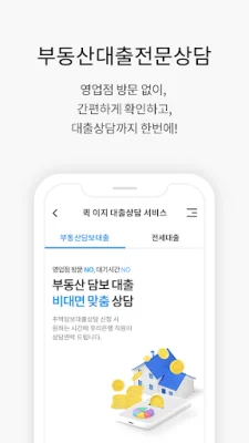 둘째로, 빠르고 쉽게 대출상담 서비스를 제공합니다. 부동산 담보 및 전세대출 비대면 맞춤 상담 서비스로, 한도 및 금리조회를 통해 나에게 맞는 대출상품을 찾을 수 있습니다.