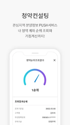 넷째로, 청약컨설팅 서비스를 제공합니다. 관심 분양정보와 청약제도/상품을 살펴보고, 우리은행 청약 컨설팅 서비스를 통해 주택마련을 함께 할 수 있습니다. PUSH 알림을 통해 신규 분양 정보도 받아볼 수 있습니다.