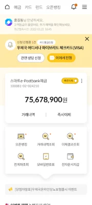 ■ Enhanced Customer Convenience Services - Introduction of Korea Post Smart Corporate Banking - Account/card opening through Mobile Registration Center - one-stop service for Korea Post Banking - Added favorite menu function for frequently used services - Introduced new fund purchase feature for Korea Post Banking - Personalized fund product recommendations through Robo Advisor - Korea Post Banking (Personal) available in 7 languages - Compare and design Korea Post's financial products (deposits/insurance/funds/cards) through the Financial Product Mall - My Page (My Home) provides a quick view of my financial information - Added account nickname and main account selection function - Added features such as large font transfer and security image selection