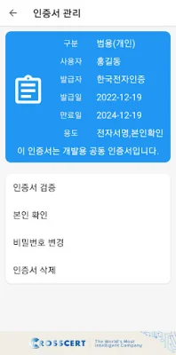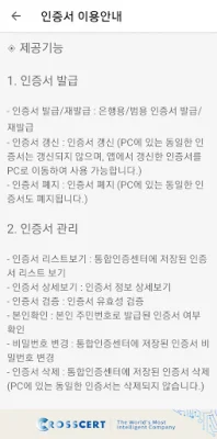 Detailed features provided by this application include certificate issuance, renewal, revocation, and management. Users can also view a list of stored certificates, check certificate details, verify the validity of certificates, change passwords, and confirm their identity using their resident registration number. Certificates can also be imported and exported between a PC and smartphone.