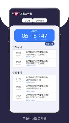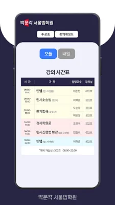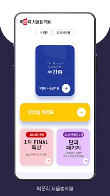 이 애플리케이션의 주요 기능 중 하나는 수강증 조회입니다. 현재 수강 중인 강의와 최근 수강 내역을 확인할 수 있어서 학습 진행 상황을 파악할 수 있습니다. 또한 강의실 배정표 조회 기능을 통해 현재 서울법학원의 강의실 배정 현황을 쉽게 확인할 수 있습니다.