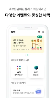 애큐온저축은행은 생활편의서비스 업체와의 제휴를 통해 다양한 할인쿠폰을 제공합니다. 또한 애큐온멤버십플러스회원을 위해 성격유형검사(MATI) 및 인성검사(PATI) 서비스를 제공하고, 할인 상품몰(기프트샵)에서 풍성한 경품이 걸린 이벤트 및 게임, 운세를 무료로 이용할 수 있습니다.