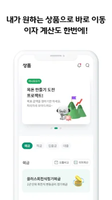 애큐온저축은행의 디자인은 FUN하고 친숙하게 변화하였습니다. "홈/마이/상품/혜택" 메뉴가 하단에 배치되어 더 쉽게 앱을 사용할 수 있습니다. 또한 설명 대신 캐릭터 슈몽이와 꿈콩이가 등장하여 화면 구성이 단순명료해졌습니다.
