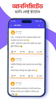 বাংলা ফানি স্ট্যাটাস এই অ্যাপটির মাধ্যামে আপনার পছন্দ সকল ফানি স্ট্যাটাস গুলো অতি সহজে সবার সাথে শেয়ার করতে পারবেন ।