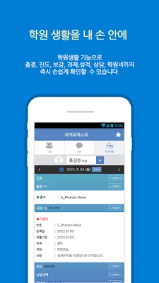 This application, called "학원친구," is a real-time notification channel that is the number one choice for connecting with home communication newspapers and has the most users. It is a mobile app that is exclusively for academies and is the representative app for academies in South Korea. With this app, you can say goodbye to receiving notifications through text messages or paper notices from your mobile carrier. Instead, you can receive real-time updates on your child's academy life, such as attendance, tuition payments, assignments, and exam scores, all through the "학원친구" app.