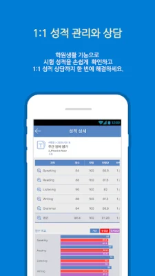 The main features of this app include receiving academy notifications, such as arrival/departure alerts, tuition payment reminders, exam scores, daily reports, assignment details, and today's lesson plan. It also provides information on your child's academy life, such as attendance, lesson plans, makeup classes, assignments, grades, consultations, schedules, and outstanding payments. Additionally, the app offers a messenger function that automatically creates a group chat between parents, students, and academy teachers, allowing for real-time communication and Q&A sessions between students and teachers.