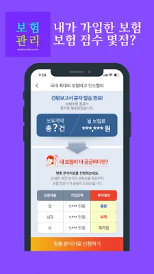 이 앱은 다양한 메뉴를 제공합니다. 내보험조회를 통해 흩어져 있는 내보험을 한 곳에서 확인할 수 있고, 보험비교를 통해 다양한 보험상품의 보험료를 비교할 수 있습니다. 또한 암보험, 어린이보험, 무해지건강보험, 자동차보험 등 다양한 보험 상품의 내용과 보험료를 확인할 수 있습니다.