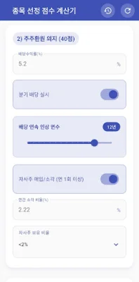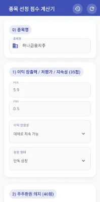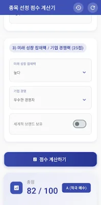 간편한 입력과 직관적 결과 기능을 통해 사용자는 데이터만 입력하면 자동으로 종목의 점수를 계산할 수 있습니다. 이를 통해 사용자는 복잡한 계산 과정을 거치지 않고도 빠르게 종목의 점수를 확인할 수 있습니다.