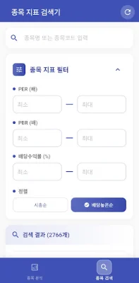 종목 점수 계산 기능은 재무건전성, 주주환원, 이익지속성 등 핵심 항목들을 기반으로 종목별 점수를 산출합니다. 이를 통해 사용자는 종목의 재무상태와 이익성 등을 종합적으로 파악할 수 있습니다. 또한 종목 지표 검색 기능을 통해 PER, PBR, 배당수익률 등 항목을 통해 범위 검색 종목을 선정할 수 있습니다.