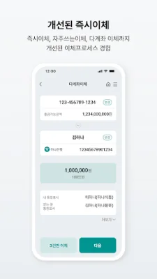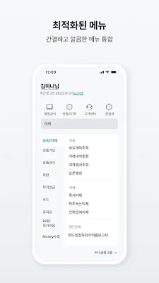 하나은행의 앱은 최근 개편되어 더욱 직관적이고 편리한 기능을 제공합니다. 메인화면은 간결하고 주요 거래에 집중하여 구성되어 있으며, 즐겨찾는 계좌에서 빠른 금융거래를 할 수 있습니다. 또한 마이메뉴에서 자주 사용하는 메뉴를 설정하여 빠르고 편리하게 이동할 수 있습니다.
