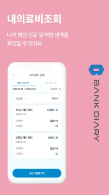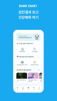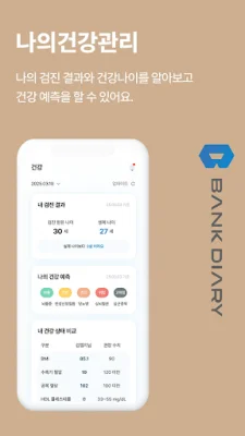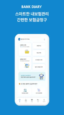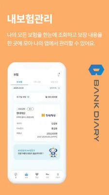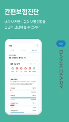 뱅크다이어리는 내 보험과 건강보험 등 모든 보험을 한 곳에서 통합 조회하고 관리할 수 있는 애플리케이션입니다. 이를 통해 내 보험금을 조회하고 청구할 보험회사를 직접 선택하여 보험금을 청구할 수 있습니다. 또한 질병 또는 상해 진단명만 알아도 바로 보험청구가 가능하며, 내가 이용한 의료기관, 약국 및 진료비, 약제비를 확인할 수 있습니다. 또한 국가검진결과를 검진 받은 연도별로 조회할 수 있으며, 전문가가 실시간으로 전송하는 보장분석 화면을 공유하면서 비대면으로 상담을 받을 수 있습니다.