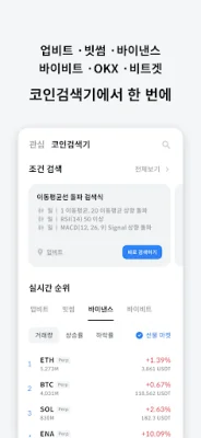 코인검색기는 다양한 코인을 대상으로 이동평균선, 거래량, RSI, MACD, 스토캐스틱, 볼린저밴드, 일목균형표 등의 보조지표를 활용하여 정밀한 조건검색 기능을 제공하는 애플리케이션입니다. 이를 통해 사용자는 업비트, 빗썸, 바이낸스, 바이비트, OKX, 비트겟 등 다양한 거래소에서 더 많은 기회를 발견할 수 있습니다.