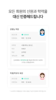 김과외는 학생, 학부모, 선생님을 위한 과외 플랫폼입니다. 현재 150만명의 학부모와 56만명의 선생님을 보유하고 있으며, 고객 만족도는 97.2%입니다. 이 플랫폼은 회원들의 신원과 학력을 대신 인증해주는 서비스를 제공합니다. 학력인증과 본인인증을 꼼꼼하게 진행하여 모두가 믿고 맡길 수 있도록 노력하고 있으며, 대학과의 연계를 통해 학력인증 프로세스를 강화하고 있습니다.