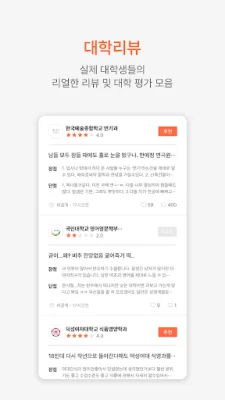 앱의 주요 기능으로는 전국 모든 대학을 검색할 수 있는 기능, 선배들이 작성한 대학리뷰와 랭킹, 대학과 학과의 생생한 정보와 꿀팁을 제공하는 기능, 질의응답을 나누는 게시판, 그리고 현재 사용자에게 맞는 대외활동, 공모전, 인턴십을 추천해주는 기능이 있습니다.
