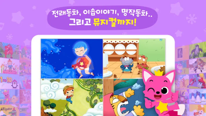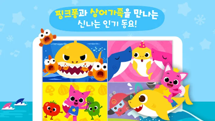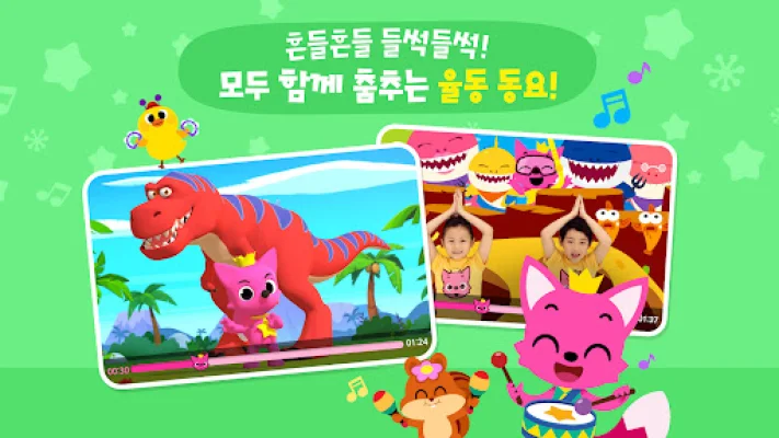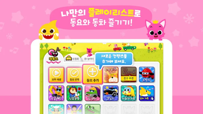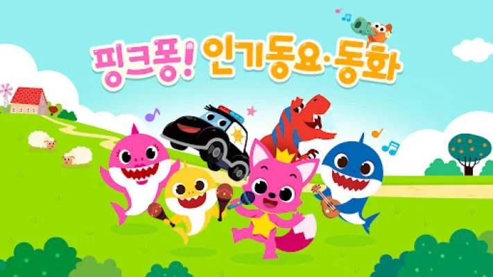 The app includes a variety of collections, such as the Pinkfong Shark Family songs, essential songs for preschoolers, songs for developing good habits, animal songs, Korean alphabet songs, and English songs. It also offers a range of songs to stimulate children's creativity and imagination, such as car songs, dinosaur songs, and princess songs.