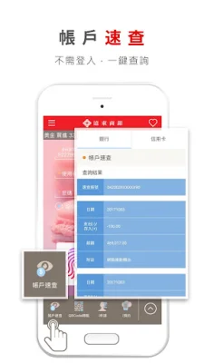 帳戶速查功能讓您不需要登入就能輕鬆查詢最近5筆存款交易明細和信用卡未出帳消費明細。只要綁定手機,就能方便地查詢帳戶資訊。