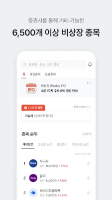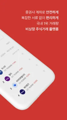비상장 주식 매물을 편리하게 탐색할 수 있는 기능도 제공합니다. 7,000개 이상의 최다 비상장 종목을 안전하게 거래할 수 있으며, 가격과 수량 조건을 확인하고 바로 거래할 수 있습니다. 또한 일반투자자 종목 30여개를 포함한 다양한 종목을 제공합니다.