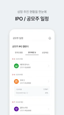 또한 IPO 공모주 정보도 한눈에 확인할 수 있습니다. 심사청구부터 상장까지 모든 상장추진 현황을 확인할 수 있으며, IPO 캘린더를 통해 공모주 청약 일정도 체크할 수 있습니다.