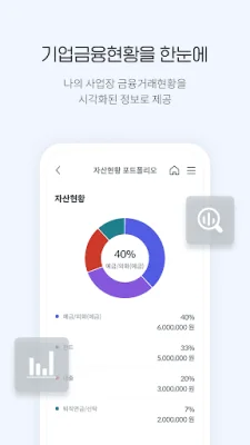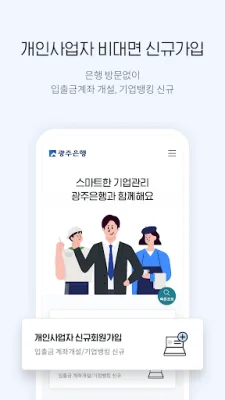 이 애플리케이션은 개인사업자를 위한 은행 비대면 서비스입니다. 은행 방문 없이도 입출금계좌와 기업뱅킹 신규를 비대면으로 처리할 수 있습니다. 고객 유형에 따라 필요한 업무를 자동으로 진행해주기 때문에 바쁜 사장님들에게 편리한 서비스입니다.