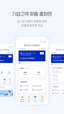 기업고객 맞춤 홈화면은 로그인 사용자의 유형과 권한에 따라 맞춤형 홈화면을 제공합니다. 주요 거래에 바로 찾아갈 수 있는 직관적인 화면 구성으로 편리한 이용이 가능합니다.
