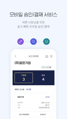 모바일 승인/결재 서비스는 바쁜 사장님들을 위해 제공되는 쉽고 빠른 서비스입니다. 인터넷뱅킹에 들어가지 않고도 모바일로 간편하게 확인하고 빠르게 결재할 수 있습니다.