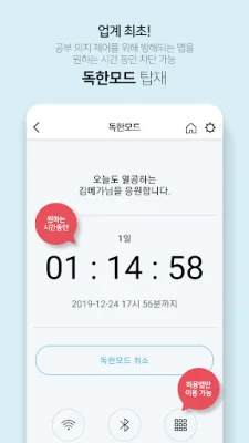 네 번째로는 업계 최초로 독해진 독한모드를 제공합니다. 독한모드는 여러분이 열공하는 동안 방해되는 앱을 차단합니다. 또한, Wi-Fi 설정, 블루투스 설정은 항상 가능하며, 시간 설정도 더 편리하게 할 수 있습니다. 잔여시간과 종료시간을 한 번에 확인할 수 있습니다.