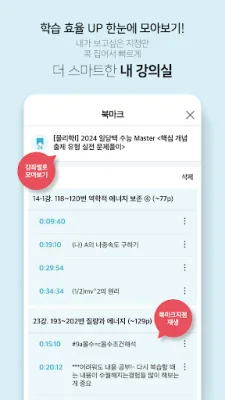 두 번째로는 스마트한 내 강의실을 제공합니다. 내가 만든 북마크는 모두 한번에 볼 수 있으며, 더 빠르게 학습 자료부터 강의 다운까지 모두 강의실에서 관리할 수 있습니다.