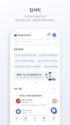 DeepSearch는 상장 기업과 비상장 기업에 대한 정보와 뉴스, 증권사 리포트, 공시, IR 자료 등을 빠르게 확인할 수 있는 애플리케이션입니다. 이를 통해 당신의 합리적인 비즈니스 의사결정을 도와줄 수 있습니다. DeepSearch를 통해 기업 정보를 정확하고 깊이 있게 분석할 수 있습니다. 기업의 실적, 최근 이슈, 주주, 재무 정보뿐만 아니라 경쟁사까지 다양한 정보를 제공합니다. DeepSearch에서는 트렌드 토픽, 뉴스, 리포트, IR, 공시, 특허 정보까지 다양한 문서 정보를 빠르게 확인할 수 있습니다. 또한 딥서치 쿼리를 통해 기업을 직접 찾거나 추천 조건을 조합하여 새로운 기업을 발굴할 수 있습니다. 시장에서 가장 주목해야 할 기업을 한눈에 볼 수 있어 트렌드를 파악하는 데 도움이 됩니다. DeepSearch는 관심 기업을 북마크하고 세분화된 알림 설정을 활용하여 관련 소식을 빠르게 받아볼 수 있도록 도와줍니다. 또한 딥서치 AI가 제공하는 인공지능 키워드와 뉴스를 실시간으로 만나볼 수 있습니다. GPT 기반의 토픽 인사이트를 통해 시장과 기업의 주요 이슈를 실시간으로 파악하고 핵심 인사이트를 요약해 드립니다. DeepSearch 고객센터는 언제나 열려있으며 고객님의 의견을 소중히 듣고 있습니다. 전화나 이메일을 통해 언제든지 문의할 수 있습니다. DeepSearch는 고객님의 비즈니스를 지원하기 위해 최선을 다할 것입니다.