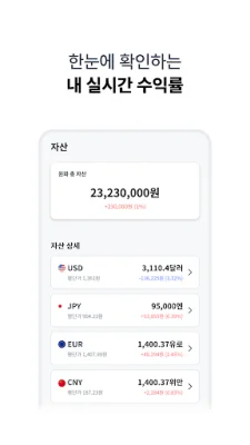 This application allows users to easily accumulate dollars by completing simple missions. Users can exchange dollars, yen, euros, and yuan without any commission fees. They can also take advantage of a 100% commission discount at Switch One to purchase overseas stocks with dollars. With this app, users can quickly check the current exchange rates by setting up a widget on their home screen.