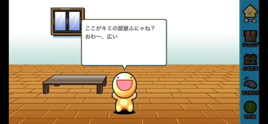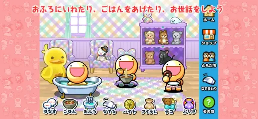 ペットのお世話では、ふにゃもらけというキャラクターにごはんをあげたり、お風呂に入れたりして育成します。ふにゃもらけは、あなたにお世話をしてもらうととても喜びます。