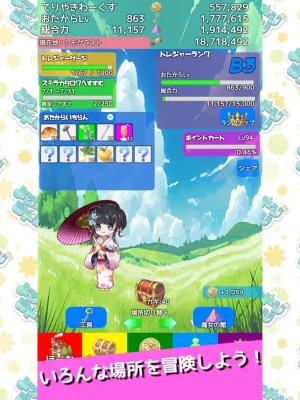 他の詳しい説明は、「そのた」→「ヘルプ」に書かれています。このゲームの特徴は、1日ちょっとだけでもゆっくり遊べること、操作が簡単で宝箱をタップするだけであること、自動入手のレベルを上げるとアプリを起動していなくてもアイテムが手に入ること、他人との競争がなく自分のペースで遊べること、そしてアプリサイズが小さいので気軽にダウンロードできることです。