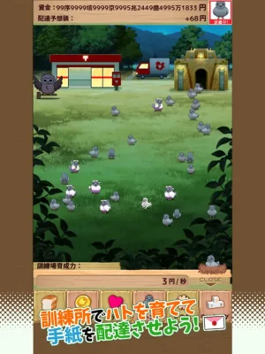 This is a game where you take care of and raise pigeons that come out of a small hut. You can feed them and send them to the post office to deliver letters. The rules are simple and you can level up the food to increase the productivity of the training center and get new types of pigeons. You can also breed pigeons once a day to get new species and have a chance to receive bonuses. However, be careful of outside enemies that may invade the training center and scare away your pigeons. You can either buy a cactus to protect them or tap on the enemies to drive them away. The ultimate goal is to collect all 40+ species of pigeons, including the rare ones.