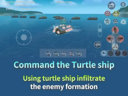 The game also offers convenient fleet movement, allowing players to designate multiple ally ships and use their strategy by conveniently moving them. They can also use various skills to lead the battle to their advantage, such as bow attack, all cannon attacks, increased defense, faster movement, and attracting enemy attention. To make their fleet stronger, players can increase the number of ships by building Panok Ship and Turtle Ship at the shipyard, as well as improve weapons and defense.