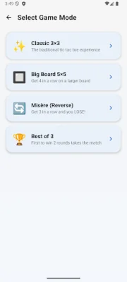 Tic Tac Toe is a popular strategy game that can also be known as Noughts and Crosses, X and O, or Tres en Raya. This app allows you to challenge your friends in 2 player mode on the same device or test your skills against a smart AI computer opponent with 3 difficulty levels. There are 4 different game modes to choose from, including the classic 3x3 board, a bigger 5x5 board, a reverse version where getting 3 in a row means you lose, and a best of 3 tournament mode. You can also track your wins and progress against each difficulty level.