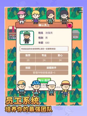 员工系统是游戏中的另一个重要组成部分,玩家可以雇佣员工来帮助管理农场。每个员工都有各种基本属性,可以提高作物的产量、品质和抗病能力,还有特殊技能可以使用。玩家可以尝试不同的员工搭配,打造最强的员工团队,从而提高农场的经营效率。
