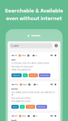 In addition to example sentences, this application also offers flashcards with autoplay and auto-pronounce loops. This is especially useful for times when users cannot use their hands, such as when they are driving or doing other activities. The flashcards will automatically play and pronounce the words, allowing users to continue learning without having to physically interact with the app.