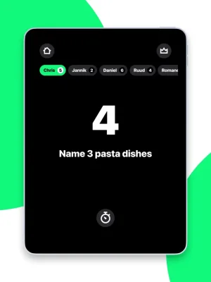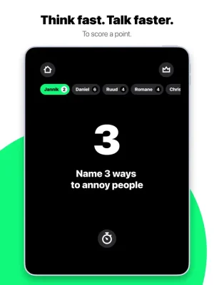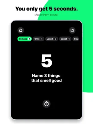 The app will indicate whose turn it is by highlighting their name in green. To ensure fairness, players must press the "start" button immediately after the topic is read, which triggers a 5-second timer. Alternatively, someone else can hold the device and press the timer for them.