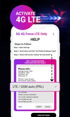 To use the app, users simply need to open the "5G 4G Force LTE" setting and select "Open Settings" to switch modes. From there, they can scroll down and find the option to set their preferred network type, such as LTE only for 4G or LTE/UMTS auto (PRL). It's important to note that the phone must be 5G or 4G compatible for these features to work, and the app will not function in areas without 4G or 5G networks.