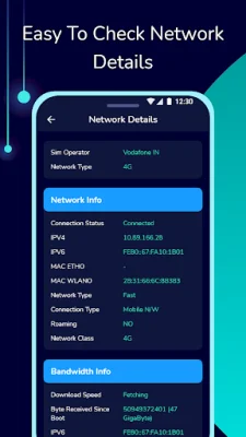 The app also provides detailed network information, including connection status, IPV4 and IPV6 addresses, MAC address, network type, and connection type. It also displays roaming status and 4G/5G/Volte status. Additionally, you can view bandwidth information such as download speed, bytes received and transmitted since boot.