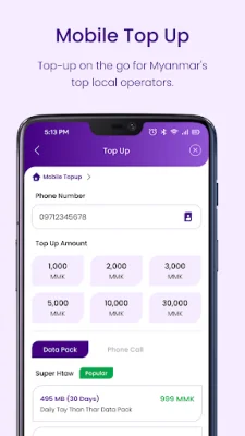 The app also offers top-up services for mobile operators, allowing users to easily add balance to their mobile phones. Additionally, users can pay all their bills directly from their wallet or account to the biller using just the biller ID. This eliminates the need for multiple transactions and makes bill payments more convenient.