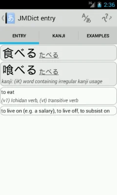 Aedict also offers integration with Dropbox, OwnCloud, and Aedict Online, which is a website dedicated to the app. It also has a Japanese font for proper character display, and includes a Kotowaza sentences dictionary from http://kotowaza.org/. Users can also export entries to AnkiDroid, and have the ability to add custom tags and colors to any dictionary entry.