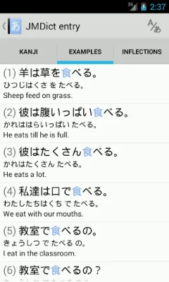 This application, called Aedict, is a powerful tool for anyone learning Japanese. It allows users to search for kanji characters by their parts or radicals, SKIP code, or by drawing the character. It also has an omnibar feature that allows for searching by kana, romaji, and various languages such as English, German, French, and more. The app also has a feature that automatically deinflects verbs, making it easier to search for conjugated forms. However, it should be noted that this app may not work correctly on some Galaxy Tab 3 devices, specifically the 10.1 Tab 3. Users of 7" and 8" Tab tablets have reported that Aedict works correctly for them, so it is recommended to not purchase this app if you own a Galaxy Tab 3 10.1 device.