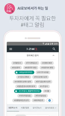 라씨로의 특징 중 하나는 투자정보 알림 기능입니다. 연기금사모펀드의 동시순매수, 수주공시의 매출액 10% 이상, 유상증자, 장중급등주분석 등 투자자가 스스로 분석하기에 시간과 노력이 많이 드는 정보를 AI로봇이 빠르게 분석하여 요약해서 제공합니다. 이를 통해 투자자는 더욱 효율적으로 정보를 습득할 수 있습니다.