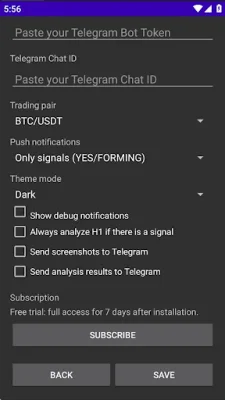 For convenience, the app also has Telegram integration, allowing users to automatically send screenshots and AI analysis results to their personal chat or bot. This feature is useful for traders who want to monitor the market 24/7 and receive updates on their trades.
