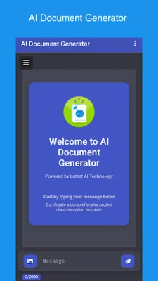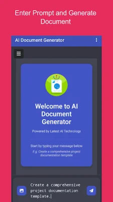 AI Document Generator is an innovative application that helps users create professional and well-structured documents with ease. Its clean and intuitive interface makes it easy for anyone to get started, simply by typing in a message or request. By entering a prompt, such as "Create a project proposal for a new software product", the app will generate a polished document tailored to your specific needs. This saves users hours of manual writing and formatting, making it ideal for entrepreneurs, students, developers, and professionals alike.