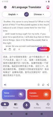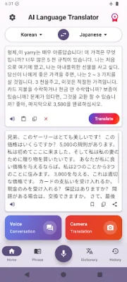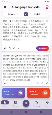 The voice translation feature uses AI speech recognition to translate your words accurately. Simply tap the microphone, speak in your language, and hear the translation spoken back to you with natural pronunciation. The camera translator allows you to point your camera at text for real-time translation, while the photo translator can translate text from images, screenshots, and documents. You can also type or paste text to translate in over 100 languages.