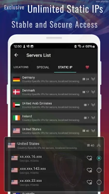 But that's not all - Vaipn Pro AI VPN also offers Ghost Jumper, a feature that allows you to instantly change your IP address and virtual location with one tap. This means enhanced online privacy and advanced anonymity as your IP, city, and country are automatically rotated every few seconds. And for those who require even more stability and trust, Vaipn Pro offers Static IP addresses across multiple countries for sensitive online activities.
