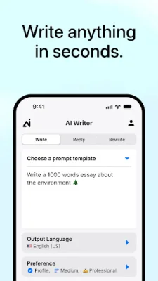 AI Writer is an innovative application that utilizes advanced GPT technology to generate high-quality content in a matter of seconds. It is designed to cater to all your writing needs, whether it's a persuasive letter or a professional email. With AI Writer, you no longer have to struggle with writer's block or spend hours crafting the perfect piece of writing. One of the key features of AI Writer is its ability to provide instant content. This means that you can write anything you need in just a few seconds, saving you time and effort. It's the perfect solution for those who often struggle with finding the right words or ideas. The application also offers a variety of ready-to-use templates to kickstart your writing journey effortlessly. These templates are designed to cover a wide range of writing scenarios, making it easier for you to get started on any project. Additionally, AI Writer provides comprehensive use cases to inspire you and help you overcome any writing challenges. Language barriers are no longer a problem with AI Writer's multilingual magic. The application can break down language barriers with ease, allowing you to write in multiple languages without any difficulty. This feature is especially useful for those who need to communicate with people from different parts of the world. With AI Writer, your creativity knows no bounds. The application unleashes your full writing potential by generating innovative ideas that will make your writing shine. It's the perfect tool for those who want to take their writing to the next level. Don't wait any longer, download AI Writer now and experience the power of cutting-edge technology in your writing. It's time to unleash your full potential and create high-quality content effortlessly. Give it a try and see the difference it can make in your writing journey.
