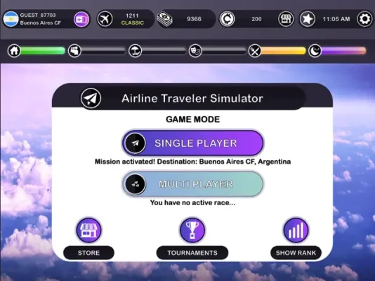 But the fun doesn't stop there. This Airline Traveler Simulator offers three game modes: Single Player, Multi-Player Races, and Multi-Player Tournaments. In Single Player mode, you can complete missions and earn money, while in Multi-Player Races, you can compete against others in races with different destinations and regions. And for a chance to win even bigger prizes, you can participate in the weekly Multi-Player Tournaments. With tournaments for each region of the world and a worldwide tournament, the competition is fierce.